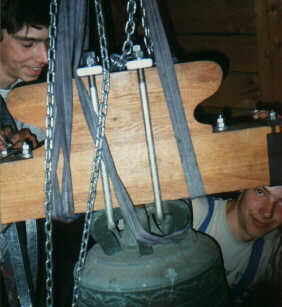 Ausgeführte Arbeiten: Stahljoch gegen Eichenholzjoch ausgetauscht, Aufhängungsbügel neu geschmiedet, Kugellager angebaut, neuen Klöppel hergestellt, Krone der Glocke mittig ins Joch eingestemmt.